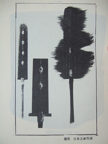 「麈尾有四柄,此即魏、晉人清談所揮之麈。其形如羽扇,柄之左右傅以麈尾之毫,絕不似今之馬尾拂麈。此種麈尾、恒於魏、齊維摩說法造像中見之。」